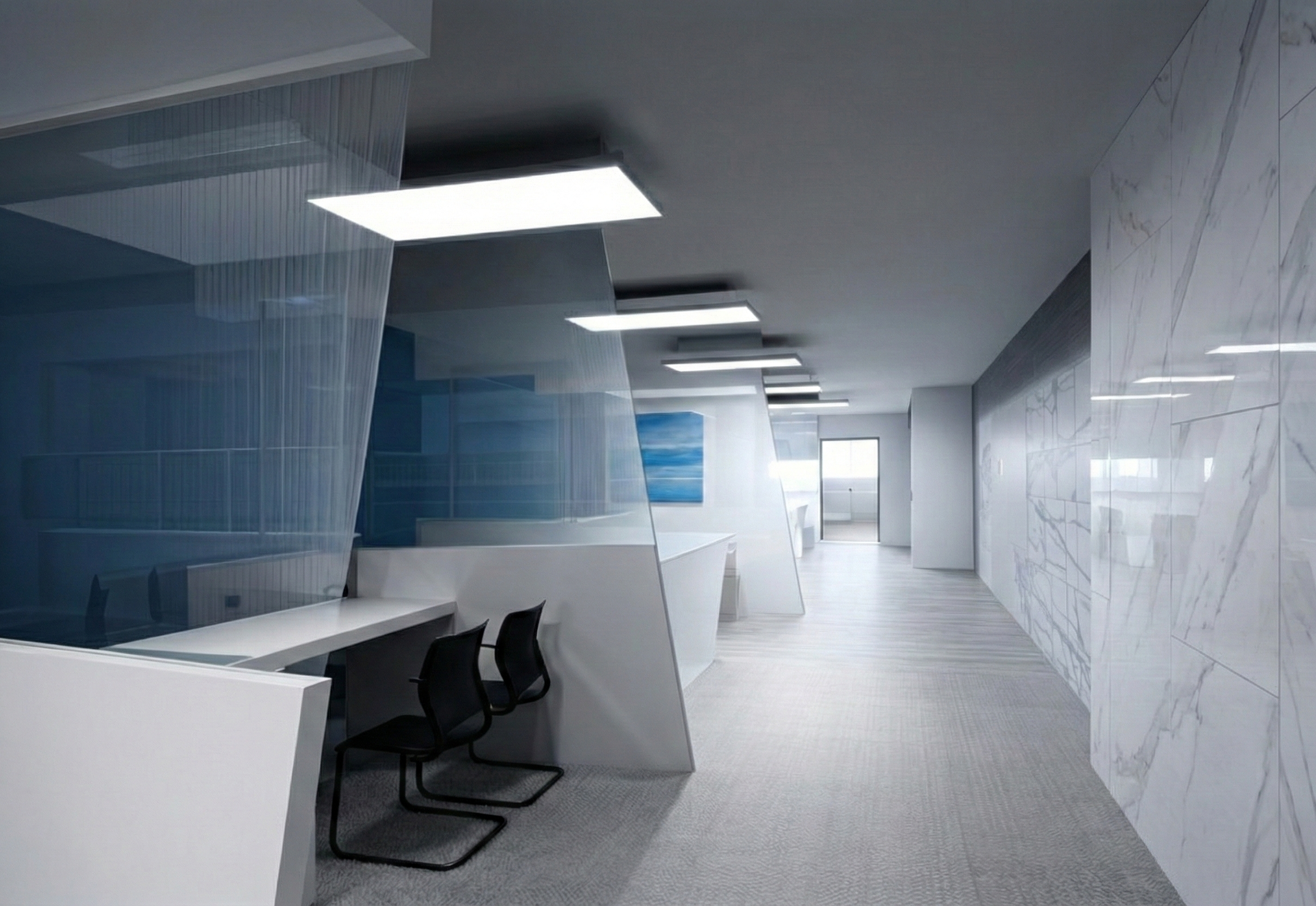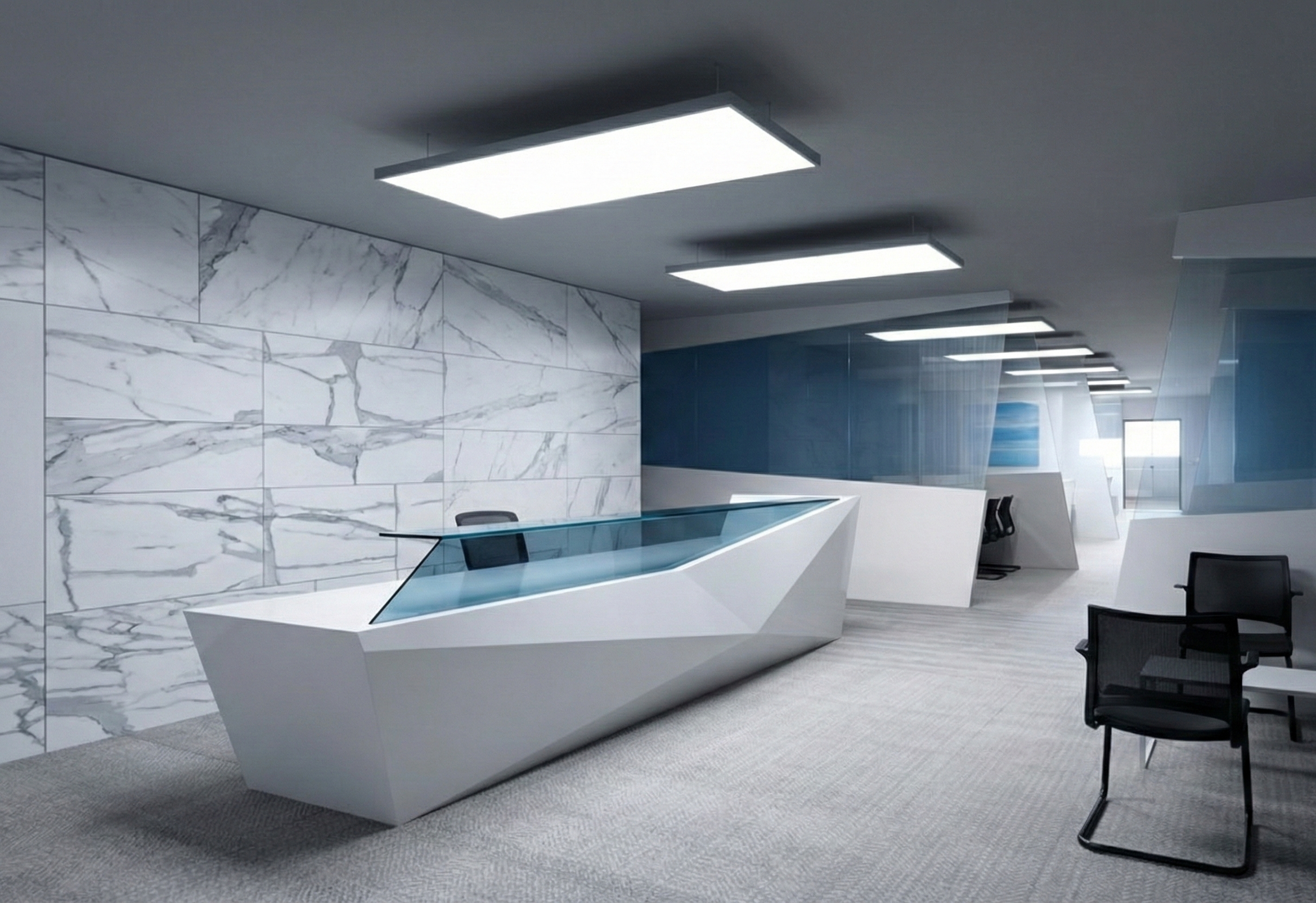 Translucent blue glazing, Calacatta marble wall cladding, acoustic fabric flooring, and custom-engineered LED lighting systems.