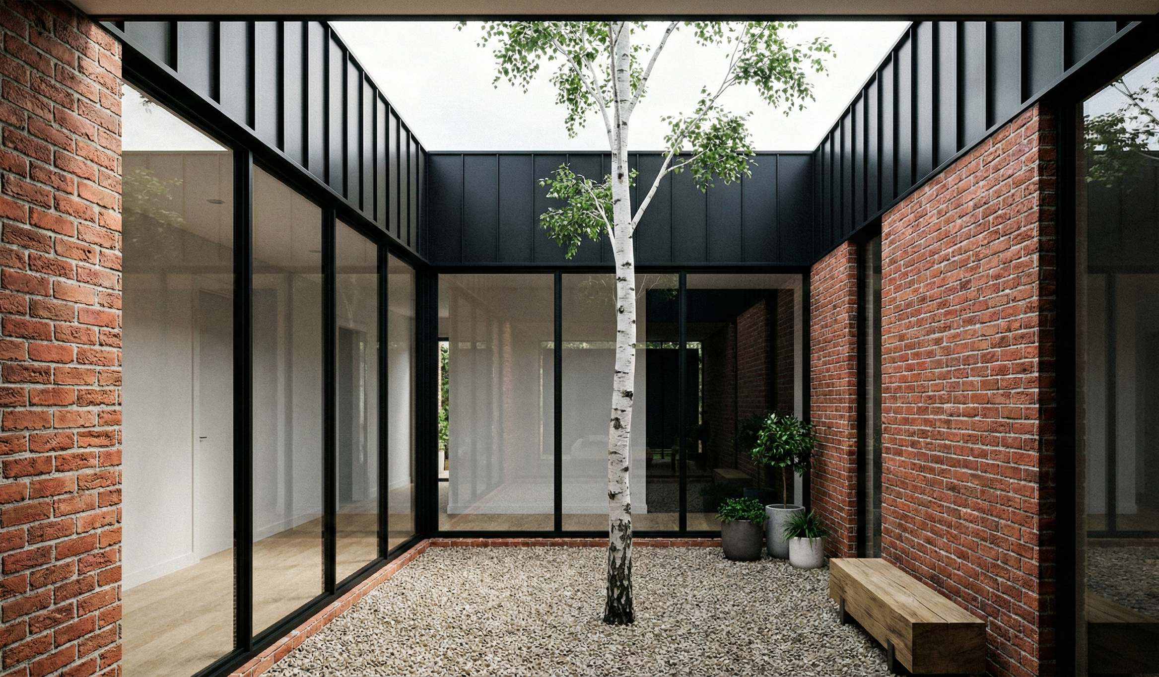 Reclaimed brick, black metal cladding, anodized aluminum glazing, and polished concrete floors.